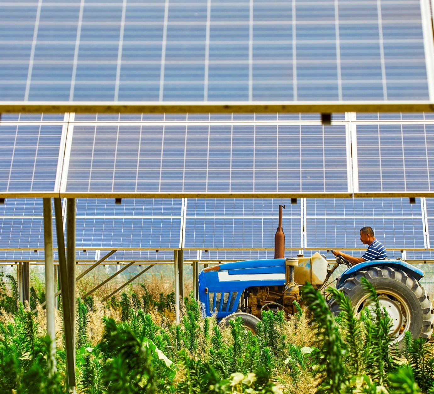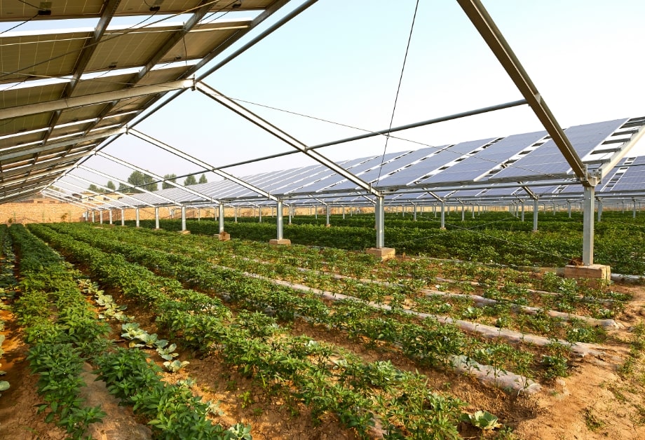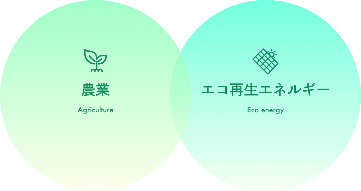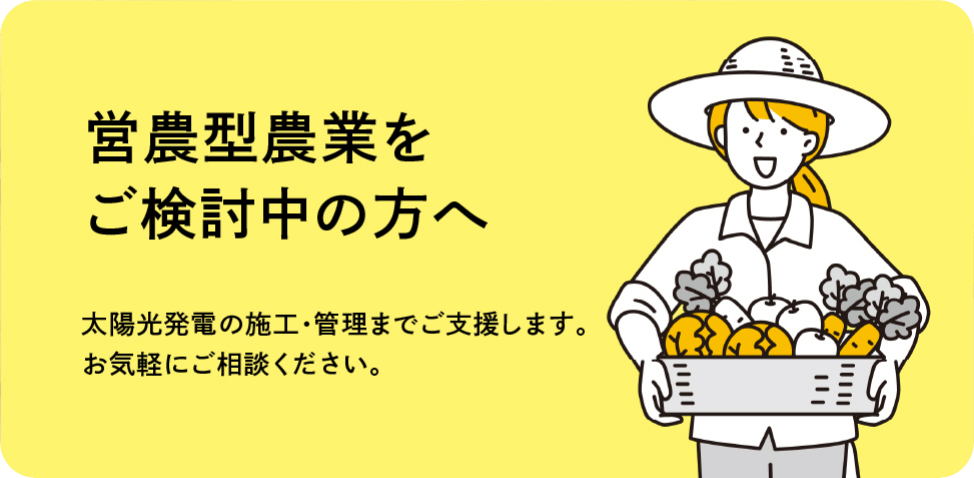 営農型農業とは、農地の上部に太陽光発電のパネルを設置し、太陽光を農業とエネルギーで共有する取り組みです。農作物を生産すると同時に、エコ再生エネルギーの導入で環境にも配慮しながら発電を行なっています。
